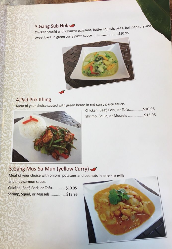 Yellow curry. Meat of your choice with onions, potatoes and peanuts in coconut milk and mus-sa-mun sauce.