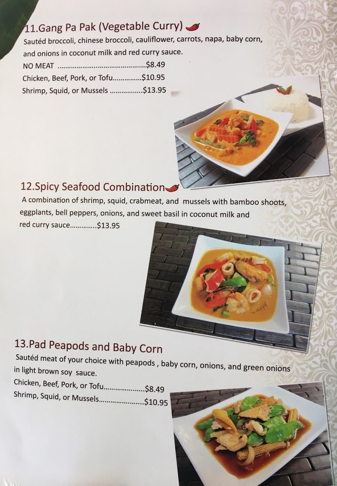 A combination of shrimp, squid, crabmeat and mussels with bamboo shoots, eggplants, onions and sweet basil in coconut milk and red curry sauce.